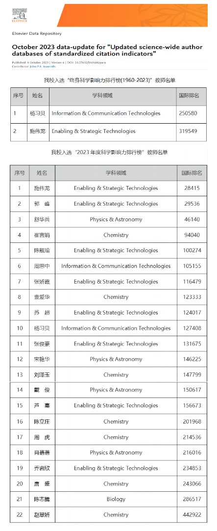 近日,美国斯坦福大学发布了2023年全球前2%顶尖科学家榜单(World’s Top 2% Scientists 2023),并在Elsevier旗下Mendeley Data发布(October 2023 data-update for "Updated science-wide author databases of standardized citation indicators")。