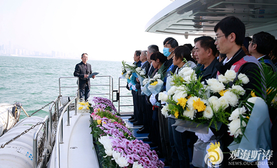伴随着文圣常先生骨灰沉入大海,亲属、好友、同事和师生代表把一朵朵鲜花撒入大海,带着对文先生最深沉的追思,肃立、默哀、鞠躬,向文先生作最后的送别。