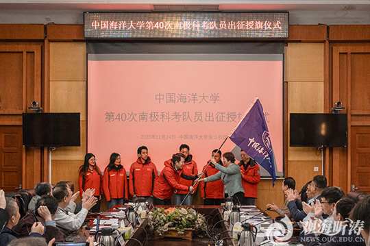 会议同时举行了中国海洋大学第40次南极科考队员出征授旗仪式。参与该航次的水产学院、海洋与大气学院、海洋生命学院师生接过张静书记授予的校旗,表示定会不辱使命,再创辉煌。