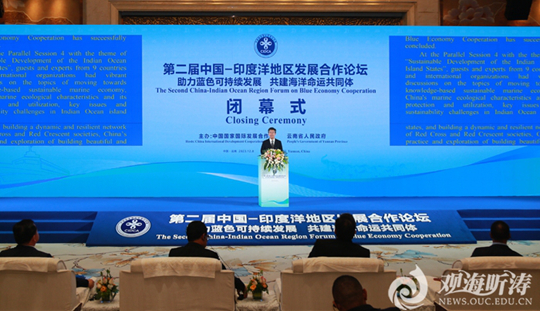 分论坛结束后,本届论坛举行了闭幕式,范其伟代表分论坛主办单位致辞。他表示,“印度洋岛国可持续发展”分论坛邀请了来自9个国家和国际组织的嘉宾和专家学者,围绕印度洋岛国可持续发展的关键问题,就海洋经济高质量发展、海洋生态特征与保护利用、和美海岛创建示范的实践与探索、海洋空间规划研究等问题进行了深入研讨,在共同推进中国-印度洋区域合作发展、应对气候变化、发展蓝色经济、加强海洋生态环境保护等多方面达成合作共识。学校希望在各部委和云南省的指导和支持下,加强同印度洋地区的学术交流与务实合作,促进中国与印度洋地区国家的互利共赢,为落实“一带一路”倡议贡献智慧和力量。