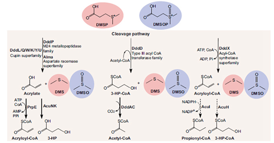 二甲基亚砜丙酸内盐(Dimethylsulfoxonium propionate,DMSOP)是一种最近在海洋环境中被发现的小分子有机硫化物,据估算,每年约有数百万吨的DMSOP产生,其在全球碳、硫循环中发挥重要作用。很多海洋微生物可以裂解DMSOP产生二甲基亚砜DMSO,但负责催化DMSOP裂解的酶及其环境重要性尚不清楚。