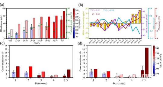 地面太阳辐射通过驱动臭氧前体物天然源排放引发长时间臭氧污染。(a)2015-2018年和2019年秋季珠江三角洲地区不同温度范围的平均臭氧MDA8浓度和地面太阳辐射(DSSR),黑色条表示一个标准差。样本量百分比用绿色菱形表示。(b)MDA8臭氧浓度相对于2015-2019年各月平均值的秋季月异常,以及DSSR,总云量(TCC)和日2m最高气温(T2)。左上(第一列)为MDA8臭氧日异常与DSSR和T2的相关系数(R),左上(第二列)为TCC与DSSR的相关系数。(c)和(d),2015-2018年(黑色线条代表标准差)和2019年珠江三角洲秋季臭氧超标事件的持续时间(x轴)及对应的超标天数(y轴),其中(c)不包括天然源排放,(d)代表基准情景与(c)的差别,即天然源排放对臭氧超标事件的贡献。