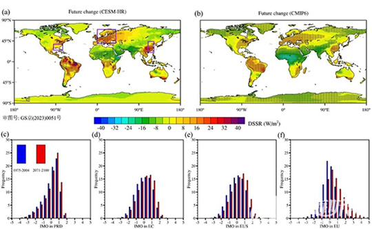 未来臭氧易发地区地面太阳辐射的增加易于诱发臭氧污染。(a-b),相对于1975-2004年秋季,本世纪末(2071-2100年秋季)RCP8.5下CESM-HR(a)和SSP5-8.5下CMIP6(b)预测的DSSR变化的空间分布。紫色框代表主要臭氧易发地区(中国东部、美国东部和欧洲)。黑色点代表统计学上显著。(c-f),基于CMIP6的珠三角地区、中国东部、美国东部和欧洲的臭氧气象指数(IMO)的直方图(历史时期1975-2004年秋季表示为蓝条,未来时期2071-2100年秋季表示为红条)。