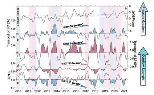 研究团队从2009年开始对吕宋海峡“深水瀑布”开展长期连续观测,先后在巴士海峡、吕宋海槽和恒春海脊关键海槛处构建了5个长期固定观测潜标站。前期,基于观测数据已系统刻画了“深水瀑布”的空间特征和运动路径,准确给出了其多年平均流量,并揭示了“深水瀑布”秋冬强/春夏弱的季节变化特征及混合驱动机制。日前,基于已获取的连续12年的流速和流量数据,研究团队首次揭示了吕宋海峡“深水瀑布”的年际变化和持续增强趋势。研究结果显示,吕宋海峡“深水瀑布”的通量在过去12年中增加了0.074±0.045Sv,约占总流量的9±5%,同时流核位温降低了-0.010±0.008℃。进一步分析显示,吕宋海峡两侧压强差年际增加趋势是“深水瀑布”增强的关键调控因素。