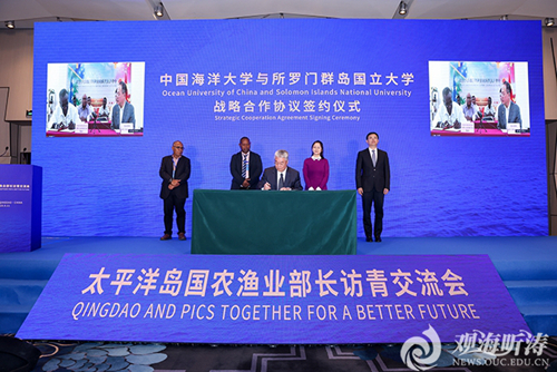 5月11日,太平洋岛国农渔业部长代表团应邀访问青岛,深入探讨开展多边合作。青岛市市长赵豪志会见了代表团一行,中国海洋大学校长于志刚参加会见。会见期间,举行了中国海洋大学与所罗门群岛国立大学合作协议签约仪式,校长于志刚与所罗门群岛国立大学校长Transform Aqorau分别代表两校线上共同签署协议。