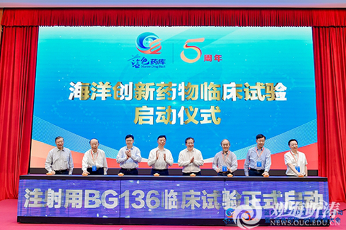 大会举行了“BG136”临床试验启动仪式。在学校、海药院、正大制药(青岛)有限公司的接续研发、联合推动和不懈努力下,“蓝色药库”的重点项目“注射用BG136”,于2022年12月通过了国家药品监督管理局审查,成为国内首个进入临床试验的免疫抗肿瘤海洋药物。该项目获准进入临床试验,标志着“蓝色药库”开发进入了新的发展阶段,初步形成了中国特色海洋生物医药研发技术体系,向着实现“蓝色药库共同梦想”的目标迈出了坚实而有力的步伐。
