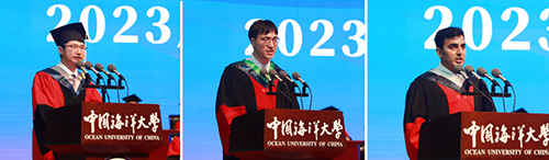 研究生指导教师代表、食品科学与工程学院副院长毛相朝教授表达了在过往时光中,见证学生成长的感动与喜悦,“凡是过往,皆为序章”,寄语广大学子未来风雨灿烂。2023届毕业研究生代表、水产养殖专业2019级博士研究生朱柏杉和来自巴基斯坦的2023届毕业留学生代表、生物化学和分子生物学专业2018级博士研究生阿里夫·默罕默德分享了自己在海大趣味横生的求学历程,也向母校、师友献上了真切的祝福。