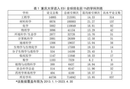 ESI从引文分析的角度,将全部科学分为22个专业领域,分别对国家、研究机构、期刊、论文以及科学家进行统计分析和排序,数据一年更新6次,更新周期为2个月。根据此次统计数据显示,全球进入ESI前1%的机构数为8579个,重庆大学位列第348位。