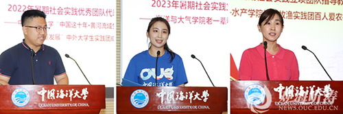 2022年暑期社会实践优秀团队代表、管理学院会计学(ACCA方向)本科生蓝椿粟,2023年暑期社会实践立项团队代表、海洋与大气学院大气科学专业研究生刘晓瑜,2023年暑期社会实践立项团队指导教师、水产学院副教授苗晶晶分别作了发言。
