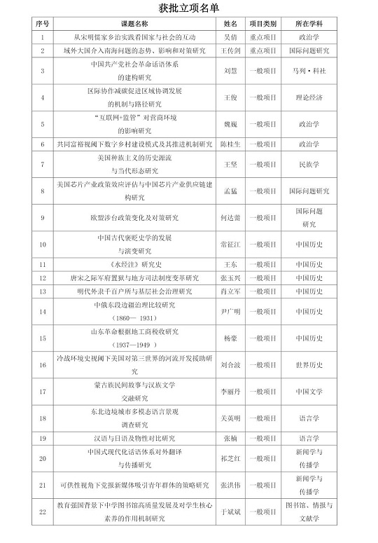 在22项国家社科基金项目中,政治与行政学院获批6项,历史文化学院获批3项,马克思主义学院获批2项,文学院获批2项,经济学院获批2项,外国语学院获批2项,欧洲文明研究院获批1项,教育学部获批1项,新闻传播学院获批1项,管理学院获批1项,期刊出版中心获批1项。