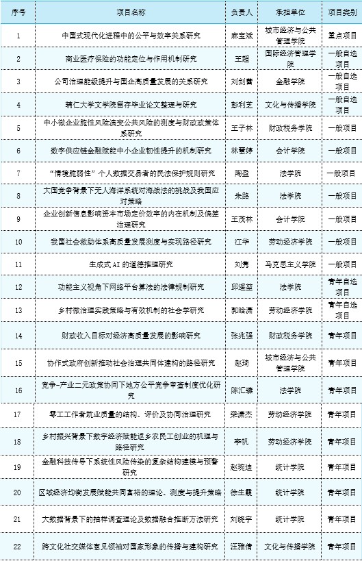 9月22日,全国哲学社会科学工作办公室公布了2023年国家社科基金年度项目和青年项目立项名单。首经贸共有22个项目获批立项,包括1个重点项目,10个一般项目,11个青年项目。立项项目总数位列全国高校58位、北京市高校第7位,市属高校第1。加上8月底公布的31项国家自然科学基金项目,截至目前首都经济贸易大学已获得国家级项目立项53项,年度立项数创历史新高。