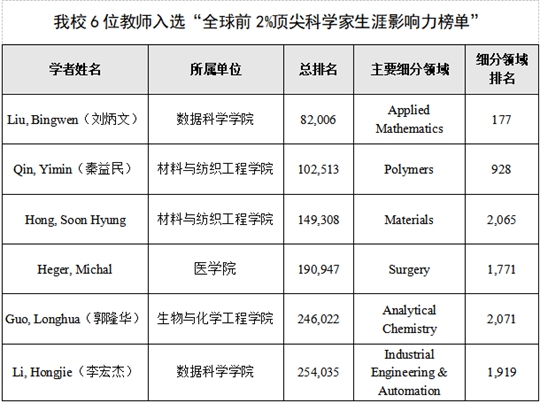 “全球前2%顶尖科学家生涯影响力榜单”中,数据科学学院刘炳文、李宏杰,材料与纺织工程学院秦益民、Hong Soon Hyung,医学院Heger Michal,生物与化学工程学院郭隆华6位教师入选。