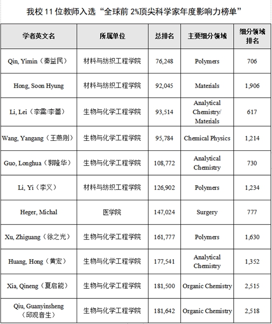“全球前2%顶尖科学家年度影响力榜单”中,材料与纺织工程学院秦益民、Hong Soon Hyung、李义,生物与化学工程学院李雷/李蕾、王燕刚、郭隆华、徐之光、黄宏、夏启能、邱观音生,医学院HegerMichal11位教师入选。