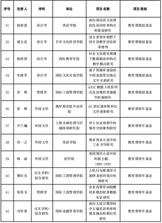 教育部人文社会科学研究一般项目层面,获立项项目中,规划基金项目5项,青年基金项目7项。学科分布上,语言学4项,外国文学4项,管理学2项,交叉学科/综合研究2项。单位分布上,国际工商管理学院3项,英语学院2项,俄罗斯东欧中亚学院、法学院、国际教育学院、国际文化交流学院、国际金融贸易学院、日本文化经济学院、上海全球治理与区域国别研究院均立项1项。