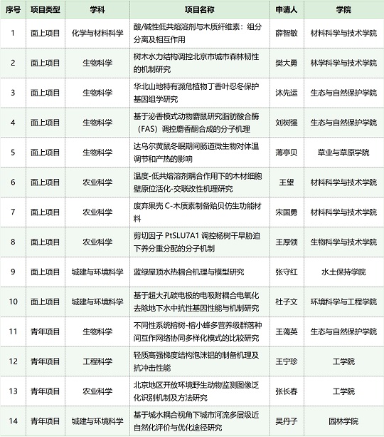日前,北京市自然科学基金办公室公布了2023年度北京自然科学基金面上及青年拟资助项目。北京林业大学共获资助14项,包括10项面上项目、4项青年项目。