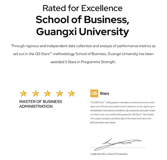 | 广西大学工商管理学院MBA项目荣获QS Stars五星评级国际认证 |