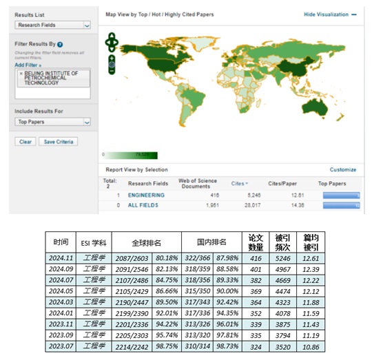 根据科睿唯安(Clarivate)2024年11月14日发布的最新一期《基本科学指标数据库》(Essential Science Indicators,简称ESI)统计数据,北京石油化工学院工程学本期继续保持在全球前1%。