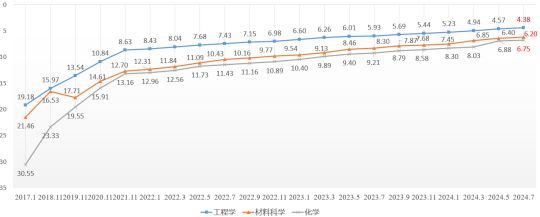 对工程学、材料科学、化学三个学科自2017年1月以来的排名情况进行统计,排名百分位变动情况如图1所示。