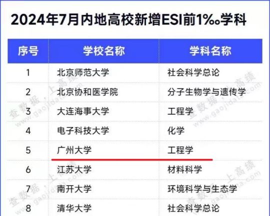 据悉,广州大学工程学、计算机科学、化学、材料科学、环境/生态学、社会科学总论、数学、植物学与动物学、地学和农业科学分别于2018年11月、2019年3月、2020年7月、2020年11月、2021年3月、2021年7月、2023年3月、2023年3月、2024年5月和2024年5月进入全球前1%,其后保持了相对排名上升趋势。此次工程学学科首次进入ESI全球前1‰,标志着广州大学高水平大学建设再次实现重要突破,国际学术影响力显著提升。