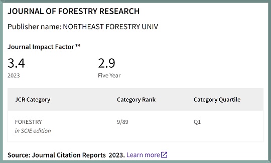 近日,科睿唯安(Clarivate)正式发布了2023年度《期刊引证报告》(Journal Citation Reports,JCR)。东北林业大学期刊《林业研究(英文)》(Journal of Forestry Research, JFR)影响因子(JIF)为3.4,在SCI收录的全球林业科学(Forestry)期刊(89种)中排名第9,排名较上一年度提高10%,首次进入学科前10%。