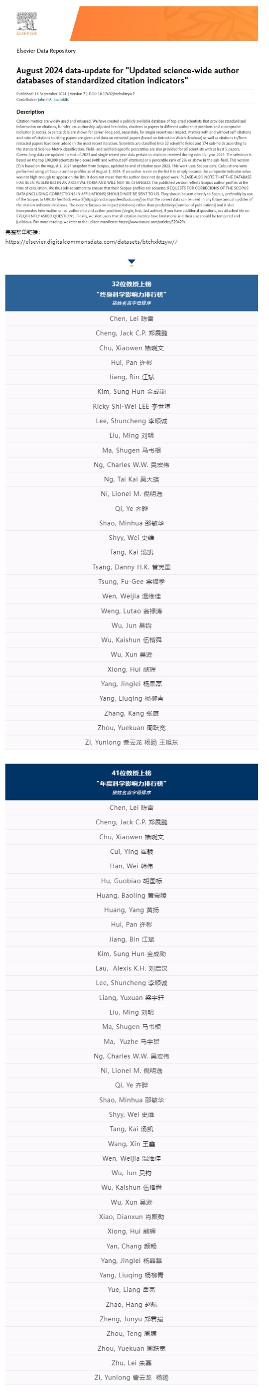 “全球前2%顶尖科学家榜单”由斯坦福大学John P.A. Ioannidis教授团队与国际权威学术出版社Elsevier联合发布。榜单基于Scopus数据库的引用数据系统分析,使用如下六种关键因素的指标来进行打分:总引用量、Hirsch H-index、共同作者修正的Schreiber Hm-index、单独作者、单独或者第一作者,单独、第一或者最后作者的文章引用量,从近700万名科学家中遴选出世界排名前2%的科学家,分为22个领域和176个子领域。为科学家长期科研表现提供了一个衡量指标,能够更客观、更真实地反映科学家的影响力。入选全球前2%顶尖科学家榜单,意味着该学者在其研究领域具有较高的世界影响力,为该领域的发展作出了杰出贡献。