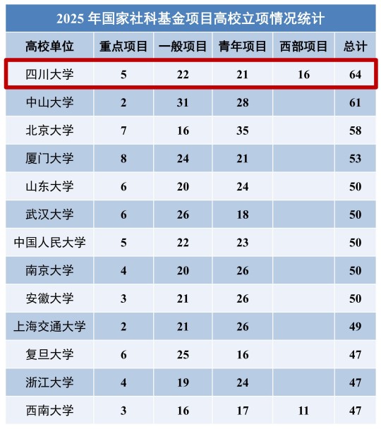 2025年四川大学国家社科基金年度项目立项总数位居全国高校首位 |