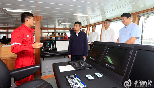 10月10日,中国海洋大学党委书记李明来到青岛奥帆基地码头,登上“东方红3”新型深远海综合科考实习船考察调研,并为本次科考航次送航。