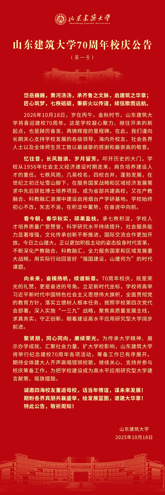 山东建筑大学70周年校庆公告(第一号)