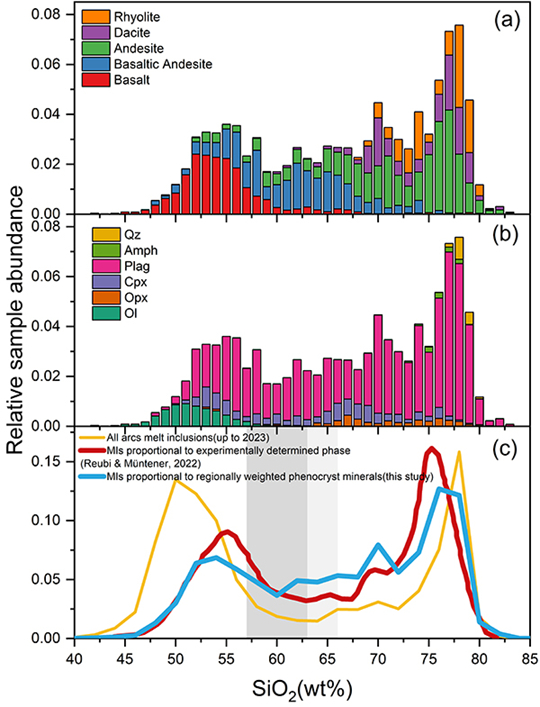 熔体包裹体是矿物在生长过程中捕获的熔体,是研究岩浆中熔体成分演化的重要对象。以往研究表明,弧火山岩熔体包裹体SiO2含量显示“双峰式”分布,支持混合模型;但也有学者指出,这一双峰式分布可能源自取样偏差,其更支持分离结晶主导。为此,研究团队对熔体包裹体数据进行了基于天然弧火山岩岩性比例和不同岩性火山岩中斑晶矿物比例的科学校正和系统分析。