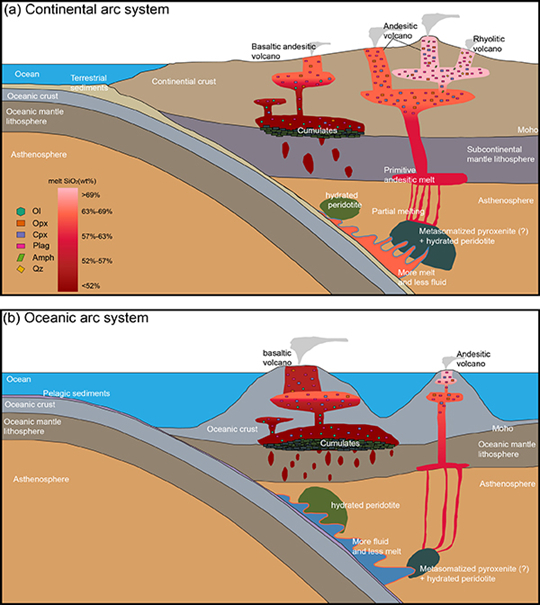 安山岩是俯冲带火山弧中的代表性岩石,其化学组成与大陆地壳相似,一直被视为理解大陆地壳形成的关键。然而,安山岩的形成机制长期存在争议。传统观点认为其源于玄武质熔体的分离结晶或由镁铁质与长英质岩浆混合形成,但这些模型难以同时解释安山岩复杂的矿物结构、地球化学特征以及弧地壳剖面结构。