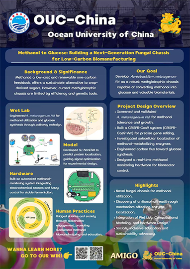 OUC-China团队今年以AMIGO(Aureobasidium Methanol Into Glucose Output)为题,聚焦气候问题背景下的“双碳”问题,重点探索一碳化合物甲醇向高附加值葡萄糖转化的技术突破。项目以多极端耐受海洋酵母Aureobasidium melanogenum为研究对象,建立CRISPR-Cas9基因编辑系统,阐明其甲醇代谢机制,通过重构关键代谢途径,构建出可从甲醇合成葡萄糖的工程菌株。为优化发酵过程,团队基于气液交换模型开发实时甲醇监测与自动进料装置,实现甲醇浓度的便捷精准测量。以上工作为利用该海洋酵母真菌进行一碳化合物生物转化制备化学品奠定基础,彰显其在可持续碳利用中的潜力。
