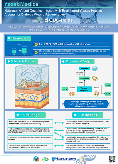 OUC-Haide团队今年重点关注糖尿病患者慢性难愈伤口再生的治疗挑战。团队推出“Yeast Medics”项目——一种基于工程化解脂耶氏酵母与L-多巴修饰温敏壳聚糖的创新可注射敷料。该系统可动态感知伤口状态,在酵母表面展示抗菌肽,并程序化释放抗炎因子(IL-4)与促血管生成因子(VEGF),在单一平台上协同解决感染、炎症、再生三大核心难题,为糖尿病患者提供一体化、自驱动、低负担的愈合方案。