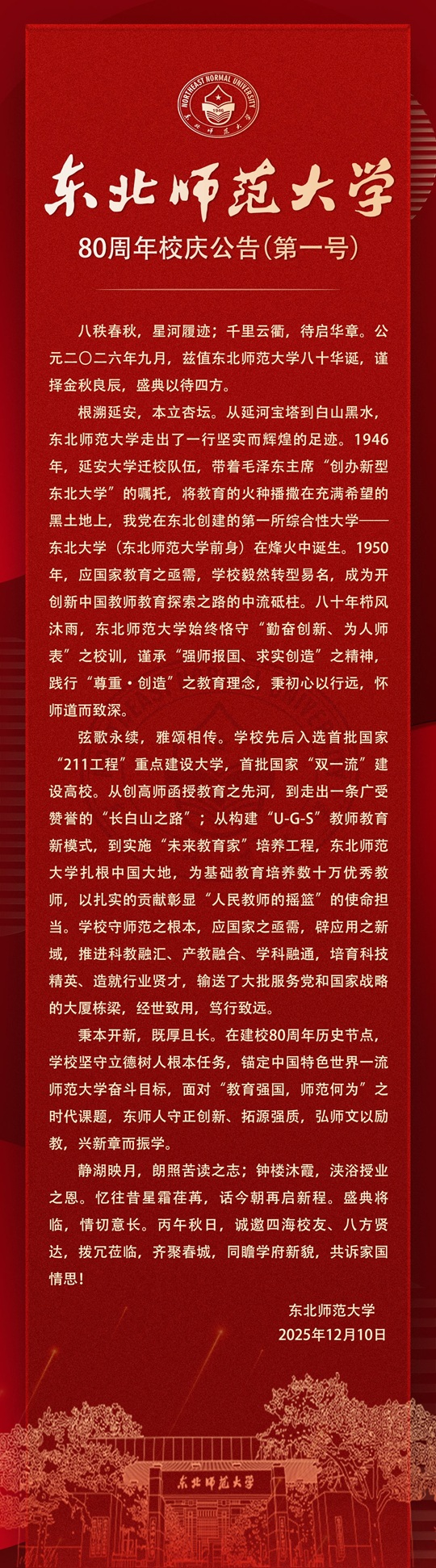 东北师范大学80周年校庆公告(第一号)