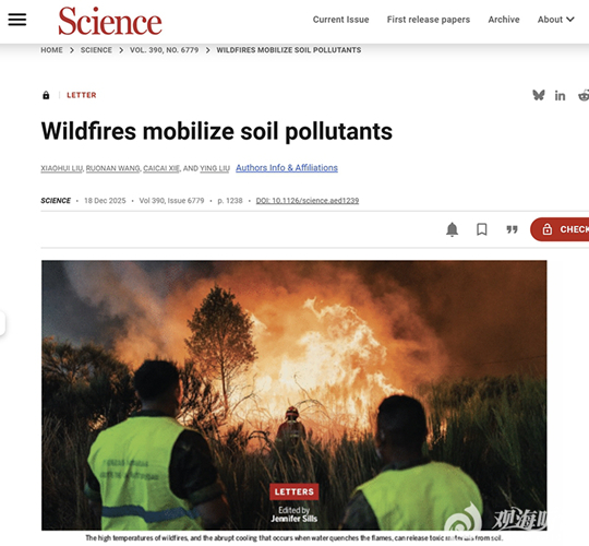 12月18日,中国海洋大学以第一署名单位,环境科学与工程学院“青年英才工程”第三层次副教授刘晓晖为第一作者在国际顶级学术期刊Science(《科学》)的Letter专栏发表了题为“Wildfires mobilize soil pollutants”(野火释放了土壤中污染物)的文章。