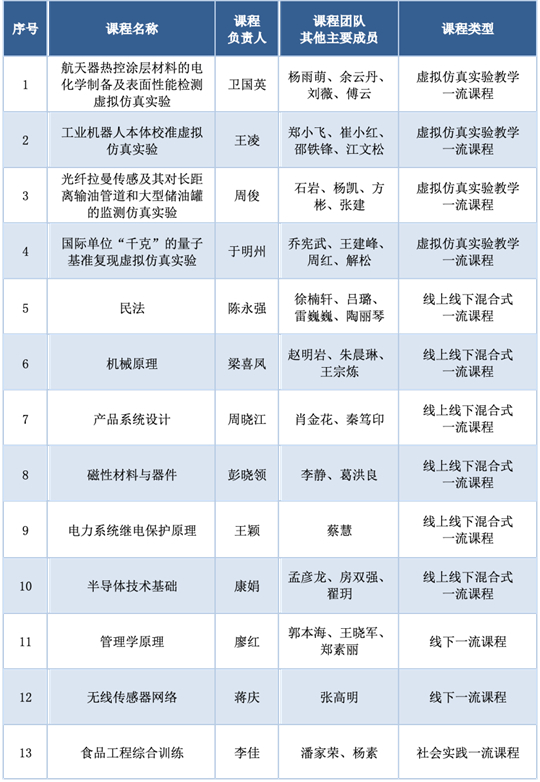 近日,教育部印发《关于公布第三批国家级一流本科课程认定结果的通知》(教高函〔2025〕9号),中国计量大学有13门课程获得国家级一流本科课程认定。其中,虚拟仿真实验教学一流课程4门,线上线下混合式一流课程6门,线下一流课程2门,社会实践一流课程1门。