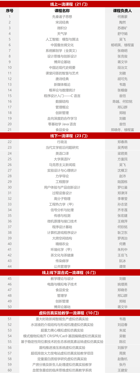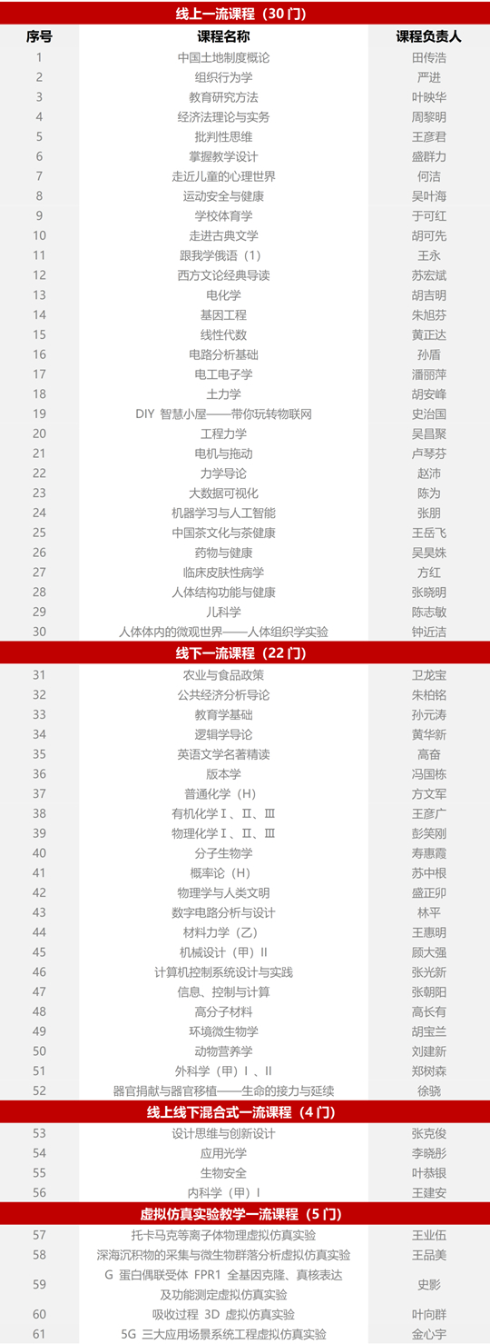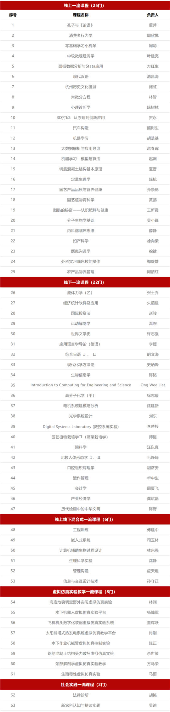 浙江大学本次共有63门课程入选,包括线上一流课程25门,线下一流课程22门,虚拟仿真实验教学一流课程8门,线上线下混合式一流课程6门,社会实践一流课程2门,入选数量高居全国高校榜首。