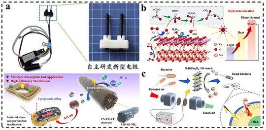 团队近年来基于仿生设计理念,通过调控导电纳米线阵列的尖端放电效应,结合光催化与电催化降解机制,以实现高流速空气或水体环境下对细菌、病毒及异味分子的有效去除。目前,团队与海信家电集团紧密合作,成功研发杀菌净味电极材料并进行场景示范应用,在净化性能与能效方面均取得重要突破。