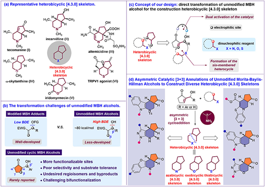 杂双环[4.3.0]骨架(氮杂、氧杂、硫杂)广泛存在于天然产物及具有重要药用价值的分子中。在现有的杂双环[4.3.0]骨架合成策略中,手性中心通常在反应早期引入,且需要多步官能团转化反应,步骤冗长。近期,研究团队在非修饰MBH醇不对称催化合成杂双环[4.3.0]骨架方面的最新进展,以“Asymmetric Catalytic [3+3] Annulations of Unmodified Morita-Baylis-Hillman Alcohols to Construct Diverse Heterobicyclic [4.3.0] Skeletons(非修饰Morita-Baylis-Hillman醇的不对称催化[3+3]环加成反应构建多样的杂双环[4.3.0]骨架)”为题,发表在国际知名学术期刊JACS Au《美国化学会会志-金》上。研究团队利用手性伯胺-酸协同双活化策略,成功实现了对非修饰MBH醇的活化,发展了非修饰MBH醇β,β′-选择性[3+3]不对称环化反应。以此为基础构建了一系列结构多样的高对映选择性手性杂双环[4.3.0]骨架。通过该反应模式,可以合成氮杂、氧杂及硫杂双环[4.3.0]骨架,具有广泛的底物范围以及优异立体控制与药物后期兼容性(图2)。该方法反应条件温和,适用于多种生物活性分子,借助该方法可以便捷合成多种药物类似物,为MBH化学、手性杂环合成及活性分子快速制备,提供了通用且高效的解决方案。