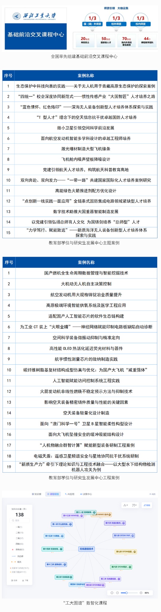 近期,中央教育工作领导小组印发《高等教育学科专业设置调整优化行动方案(2025—2027年)》,对深入推进学科专业设置调整优化工作作出系统部署,明确提出实施学科专业内涵更新行动,加快教学内容迭代,强化人工智能赋能教育教学。西北工业大学依托“工大图谱”研究生数智化课程体系建设,首批入选教育部教育强国建设三年行动计划综合改革试点高校。