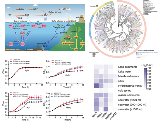 硫化氢(Hydrogen sulfide,H2S)、甲硫醇(Methanethiol,MeSH)和二甲基硫(Dimethylsulfide,DMS)是海洋中主要的含硫气体,在全球硫循环、趋化作用及气候调节中发挥关键作用。微生物可通过S-甲基化作用将具有细胞毒性的H2S和MeSH转化为无毒的DMS,该过程在陆地与海洋环境中分别主要由MddA或MddH酶催化完成。然而,海洋和陆地中广泛分布的放线菌门细菌含有未知的Mdd酶,导致该代谢途径的潜力长期被低估。