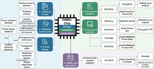 Genes in Diverse Environments”(DSMG-Chip:高通量简并qPCR芯片精准解析海洋微生物有机硫代谢基因)的研究论文。该研究开发了微生物DMSP/DMS循环高通量简并qPCR芯片DSMG-Chip,实现了27个有机硫代谢基因的同步绝对定量(图2)。研究人员将42对简并引物集成于高通量qPCR芯片,结合智能数据库构建和系统发育分析,建立了从基因检测到环境应用的完整技术体系。基于特异性验证、灵敏度测试和准确性评估,证实了芯片在复杂环境样本中的可靠性,并通过多维度生物信息学分析解析了全球海洋有机硫代谢基因的分布特征和生态意义。