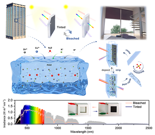 图1. 准固态铜锌双金属可逆电沉积智能窗工作机制与光热调控示意图