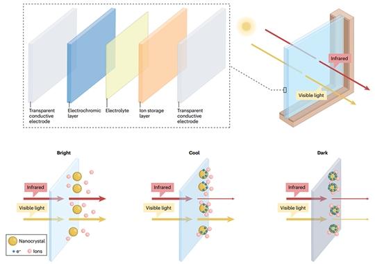基于在光热调控电致变色智能窗领域的持续研究积累,课题组联合山东大学和加拿大阿尔伯塔大学等研究团队,全面讨论了无机电致变色智能窗(ESW)的工作模式、组装工艺和实施方法。该合作论文详细探讨了ESW能效、材料选择、电化学过程和光热调控性质之间的联系,指出在无机ESW中采用双波段调控与可逆金属沉积技术的优势,并强调了提高成本效益、规模化生产和长期耐久性等方面的重要性。相关综述论文以“Inorganic