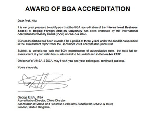 2月26日,北京外国语大学国际商学院收到英国商学院毕业生协会(Business Graduates Association,简称BGA)发来的官方贺信,祝贺学院顺利通过BGA国际金牌认证,初次认证时限为三年。