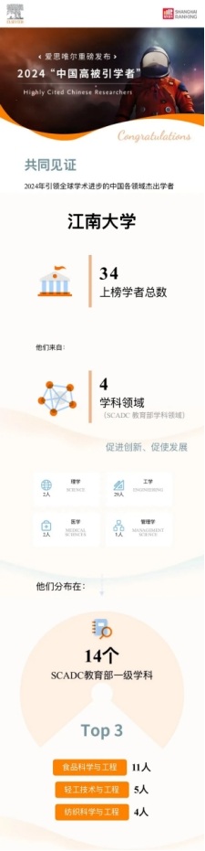 3月25日,爱思唯尔(Elsevier)正式发布2024年度“中国高被引学者”(Highly Cited Chinese Researchers)榜单。江南大学在本年度评选中表现亮眼:入选学者总数达34人,较上一年度增加10人;上榜人数位居第40位,较上一年度提升11个位次,实现入选规模与排名的双突破。