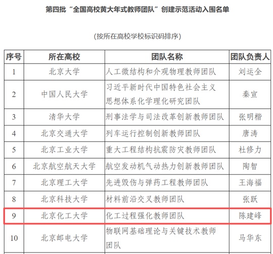 近日,教育部印发通知,公布第四批“全国高校黄大年式教师团队”创建示范活动入围名单,北京化工大学化工过程强化教师团队成功入选。