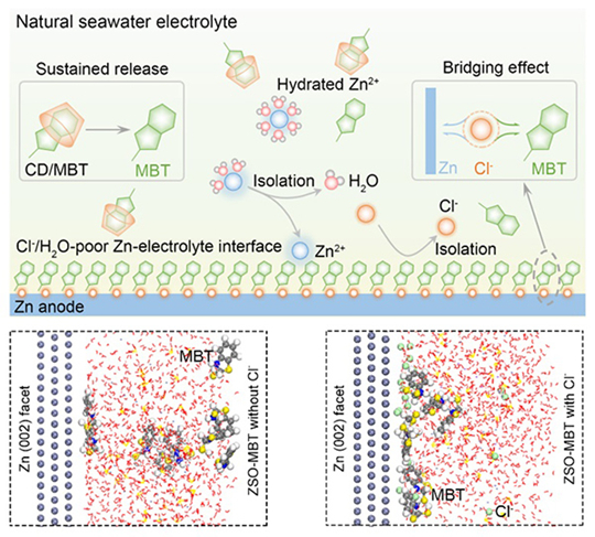 海水锌离子电池可为海洋监测、深海装备及沿海可再生能源储存提供直接、安全的能源供给,在海洋应用中具有独特优势。然而海水电池中富氯/水的负极-电解液界面,给锌金属负极带来严重的腐蚀挑战。针对此挑战,研究团队设计了一种含有主客体复合物添加剂的海水电解液。该电解液以2-巯基苯并噻唑(MBT)作为客体分子,借助环糊精(CD)主体实现缓释控制,有效调控其在电解液中的含量。氯离子通过桥接效应在电极界面构筑出致密的MBT屏障,形成贫氯/贫水的局部微环境,显著抑制了锌负极的腐蚀行为,延长其循环寿命。实验表明,锌负极在实际放电深度42.7%的条件下实现了400小时以上的稳定循环;N/P比为1.92的全电池经历600次循环后仍保持99%的容量,安时级软包电池初始放电容量达1.21Ah,并可稳定循环50圈。该研究为发展低成本、实用型海水锌离子电池提供了新思路。相关论文以“Chloride-Bridged Compact Interfacial Shielding for Practical Seawater Zinc Batteries”(氯桥接致密界面屏蔽实现实用型海水锌电池)为题发表于《德国应用化学》,并被评选为“Very Important Paper”,该论文的第一作者是材料科学与工程学院2022级博士生范文杰。