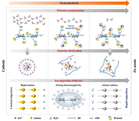 课题组还开发出一种厚度仅18μm的疏水梯度纤维素隔膜。该隔膜借助疏水梯度结构与表面负电荷的协同作用,有效阻隔氯离子渗透并降低界面水活性,不仅为水合锌离子构建了逐步脱溶路径,促进高聚集态电解质的形成以抑制副反应,还通过静电屏蔽效应排斥氯离子、均化锌沉积,进一步提升了电池的循环稳定性。采用该隔膜的锌负极在天然海水电解液中实现了2900小时的长循环寿命,在50%放电深度下稳定运行1300小时,所组装的全电池体积能量密度达233.1 Wh L⁻¹(N/P=2.3)。该隔膜技术为海上储能系统提供了关键材料支撑。相关成果以“Hydrophobicity Gradient in Ultrathin Cellulose Separators for Durable Seawater-Based Zinc Batteries”(超薄疏水梯度纤维素隔膜实现长效海水锌电池)为题发表于《先进功能材料》,该论文的第一作者是材料科学与工程学院2023级博士生董艳莹。