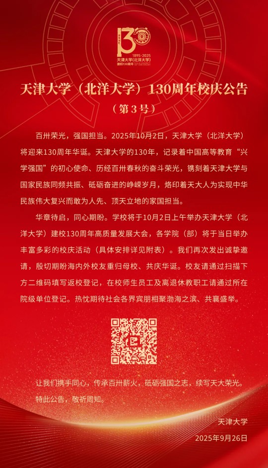 天津大学(北洋大学)130周年校庆公告(第3号)