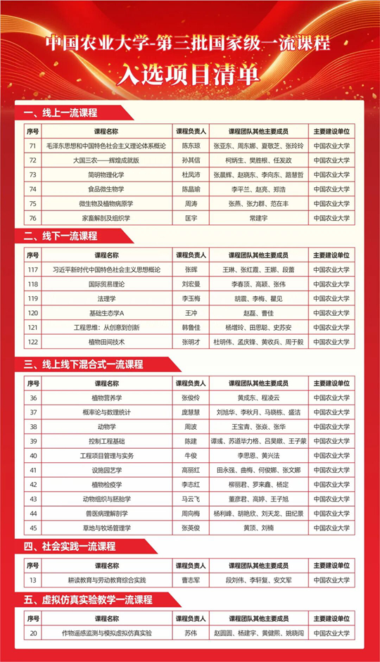 近日,教育部发布《教育部关于公布第三批国家级一流本科课程认定结果的通知》(教高函〔2025〕9号),中国农业大学共有24门课程入选第三批国家级一流本科课程。入选课程中,线上一流课程6门、线下一流课程6门、线上线下混合式一流课程10门、社会实践一流课程1门、虚拟仿真实验教学一流课程1门,学校一流本科课程建设再获新进展。